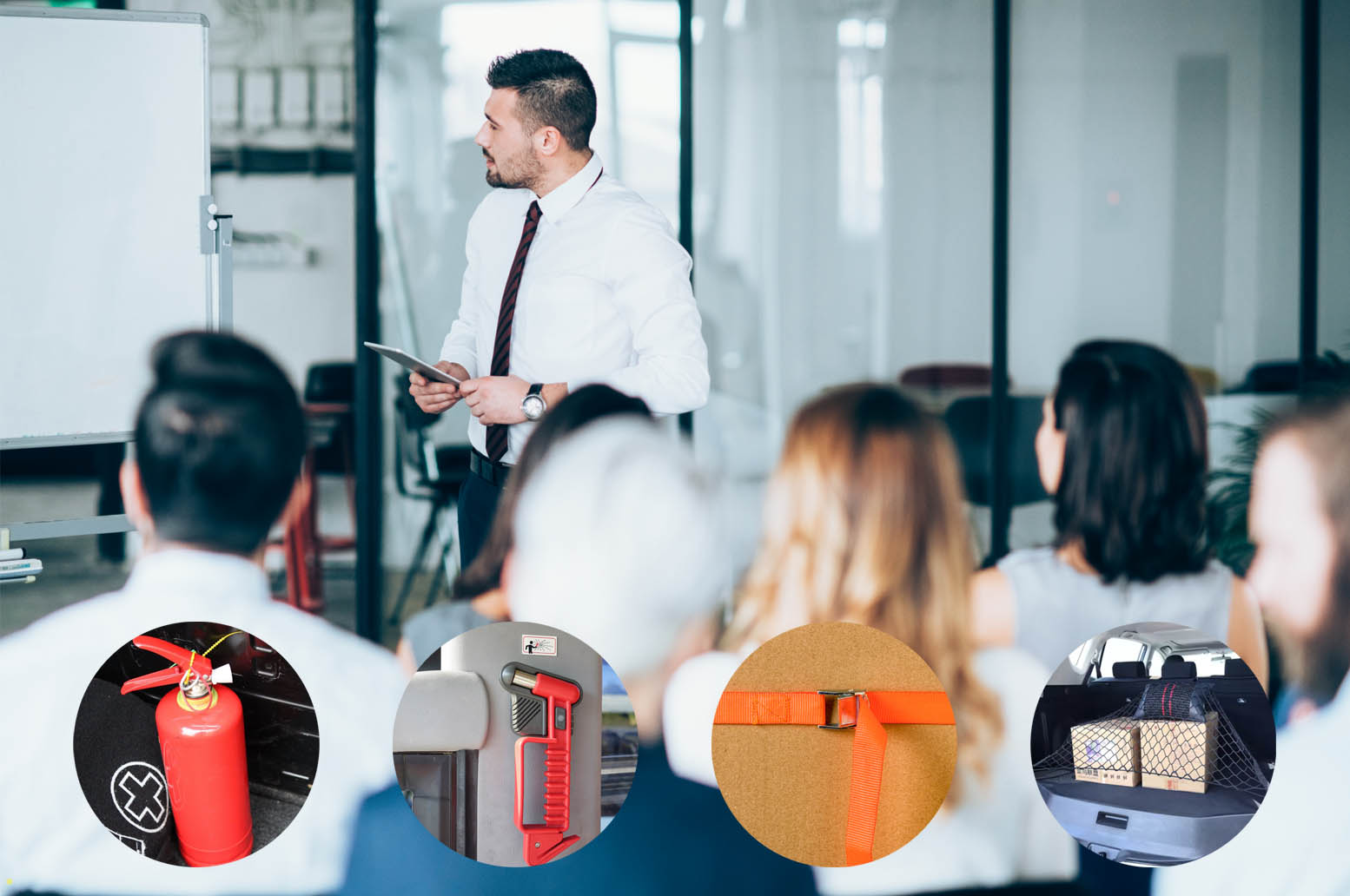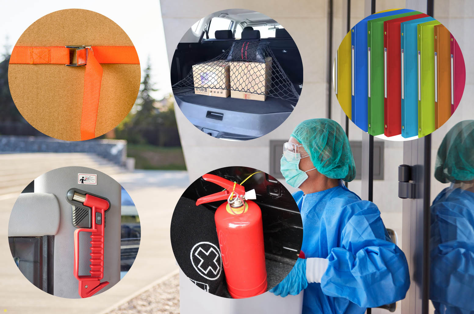 Composition du kit : Extincteur voiture, Brise vitre / coupe ceinture , Sangle voiture, Filet voiture, Classeur plastifié 50 pages